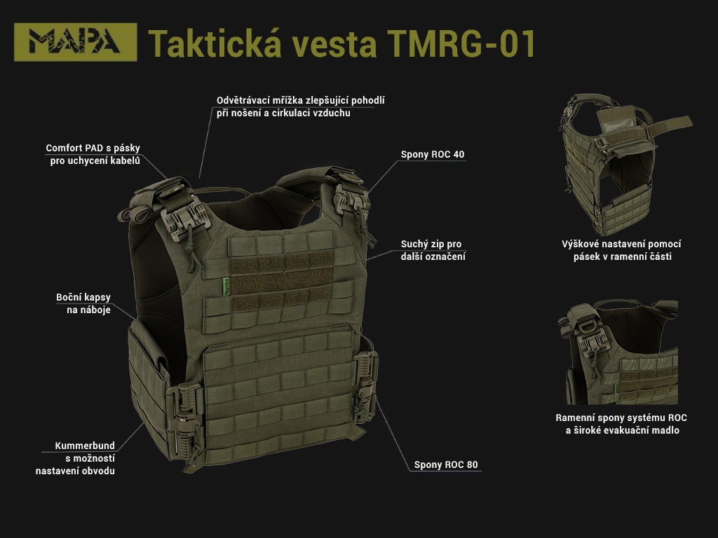 Ve vestě TM01 byly použity odolné rychloodepínací přezky typu ROC 40 a ROC 80. Na přední straně vesty v úrovni hrudníku je umístěn velcro panel umožňující montáž emblémů.