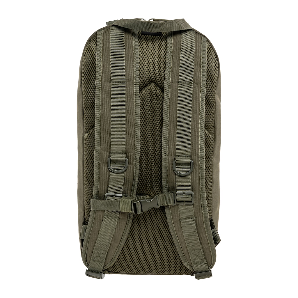 Taktický batoh o objemu 15 l v olivové barvě. Vyrobený z robustního polyesteru odolného proti roztržení, zevnitř potažený vrstvou PVC chránící před vlhkostí. Hodí se pro taktické a survivalové účely, ale i pro každodenní použití.