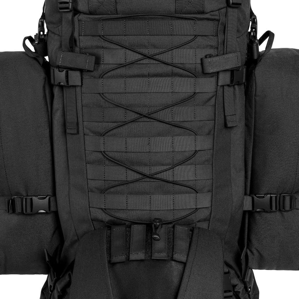 Taktické operace: Díky popruhům MOLLE, montážním lištám a četným upínacím bodům je možné připevnit různorodé vybavení a rozšířit batoh o taktické doplňky.
