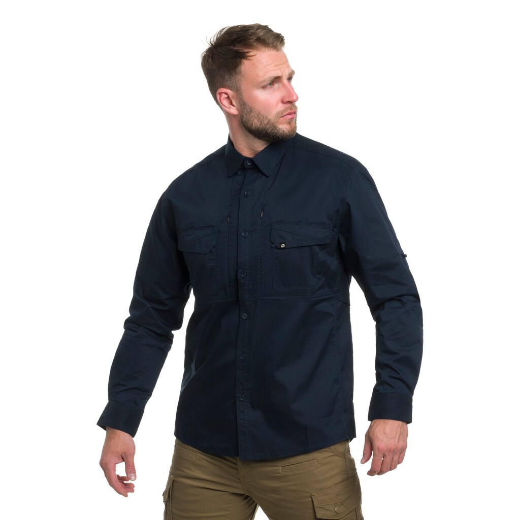 Komfortables und funktionales taktisches Hemd mit langem Ärmel in der Farbe Midnight Blue, hauptsächlich für Uniformdienstmitarbeiter entworfen, aber auch für aktive Personen, die hohe Qualität und Praktikabilität schätzen. Sein relativ lockerer Schnitt passt sich hervorragend den Körperbewegungen an und harmoniert auch mit einer flachprofiligen ballistischen Weste oder IWB-Holster (Inside the Waistband).