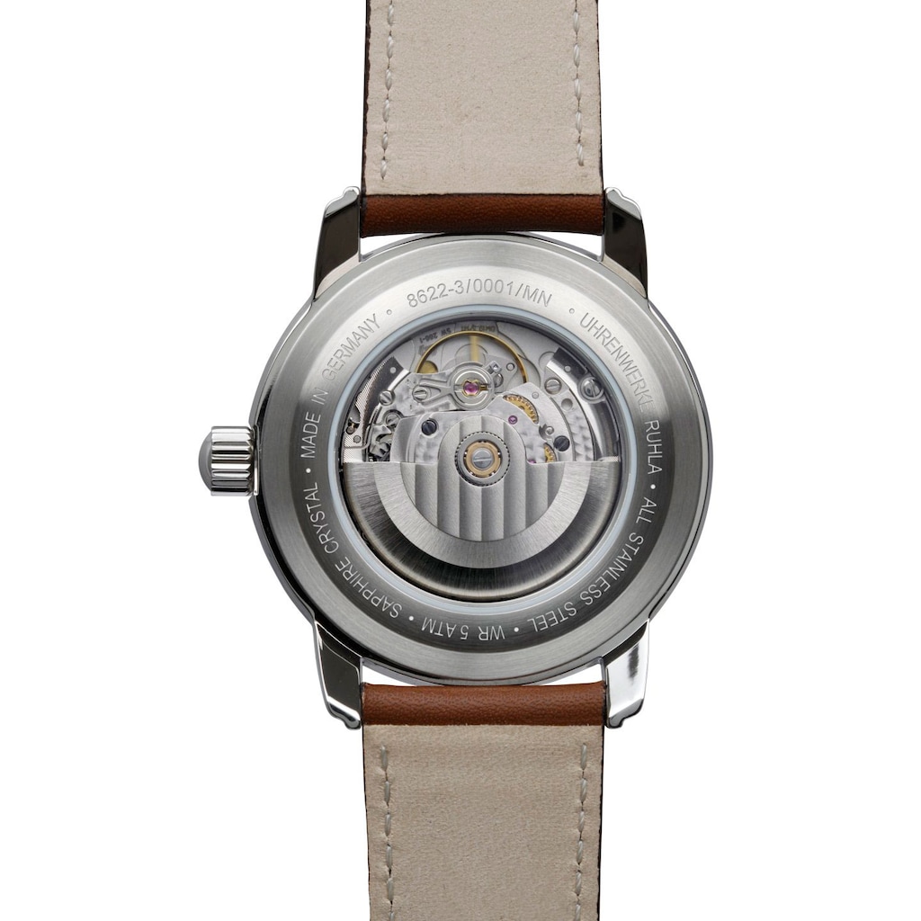 Das Zifferblatt wird durch ein hochwertiges kratzfestes Saphirglas geschützt. Der Glasboden ermöglicht die Beobachtung der Uhrwerkfunktion. Auf dem Zifferblatt befindet sich eine Datumsanzeige, die den aktuellen Tag des Monats zeigt, sowie zwei zusätzliche Sub-Zifferblätter - Stunden und Sekunden. Die Uhr zeichnet sich durch eine Wasserdichtigkeitsklasse von 5 Atmosphären aus (hält einem Druck von bis zu 50 Metern Wassertiefe stand), was einen Schutz vor Spritzwasser und Feuchtigkeit bietet.