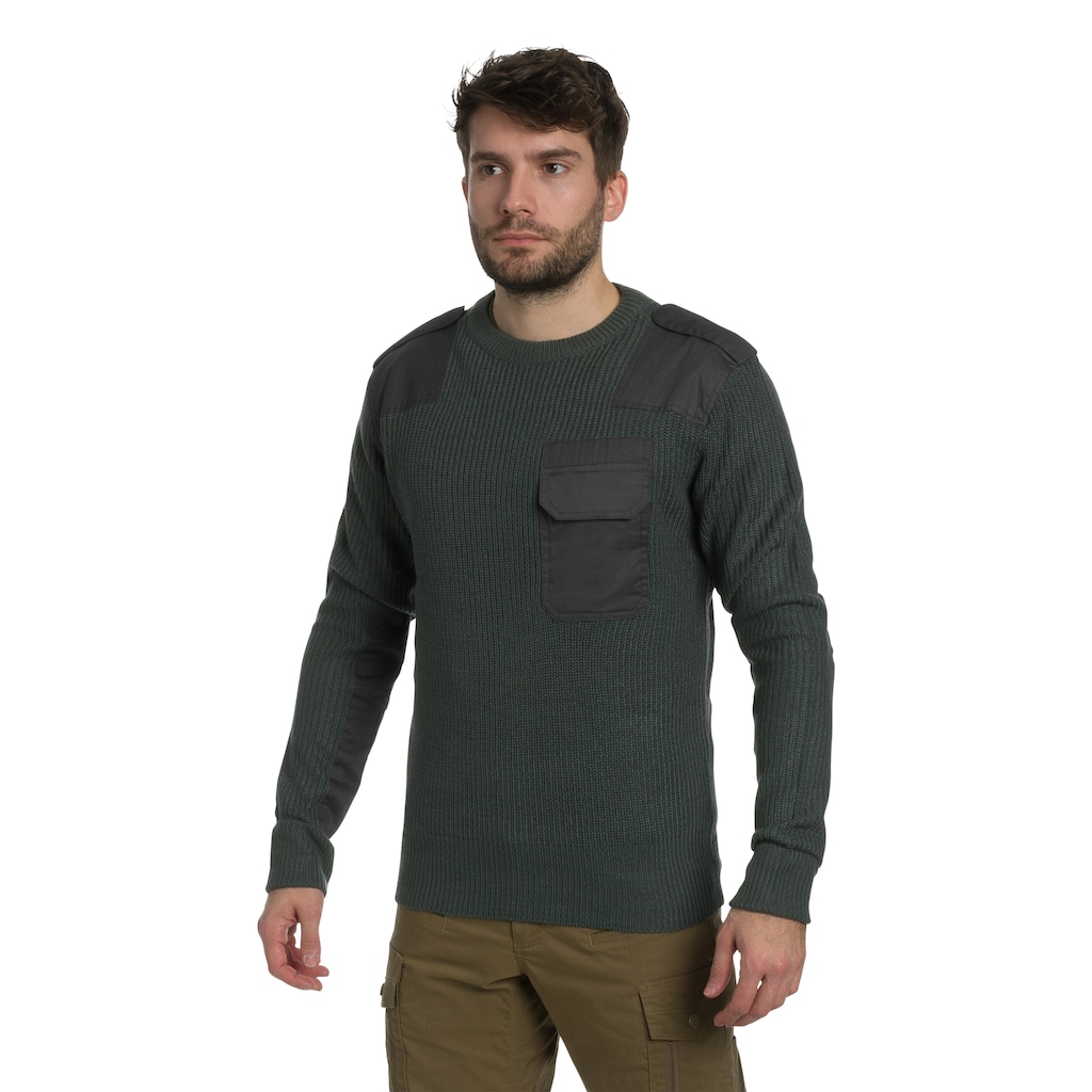 Sweater by Brandit in an anthracite shade inspired by the model used by the Bundeswehr. Made from a blend of polyacrylic and cotton, it does not stretch, does not pill, and provides good insulation against the cold on chilly days.
