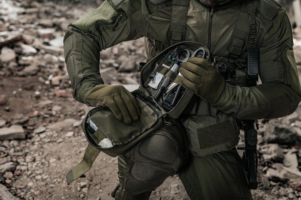Olive tactical trousers with a high waist, made from PoliCotton RipStop fabric (35% cotton, 65% polyester). This material is characterized by high resistance to abrasion and tearing and is lighter and dries faster than 100% cotton fabric. Knee protectors are made of EVA foam.