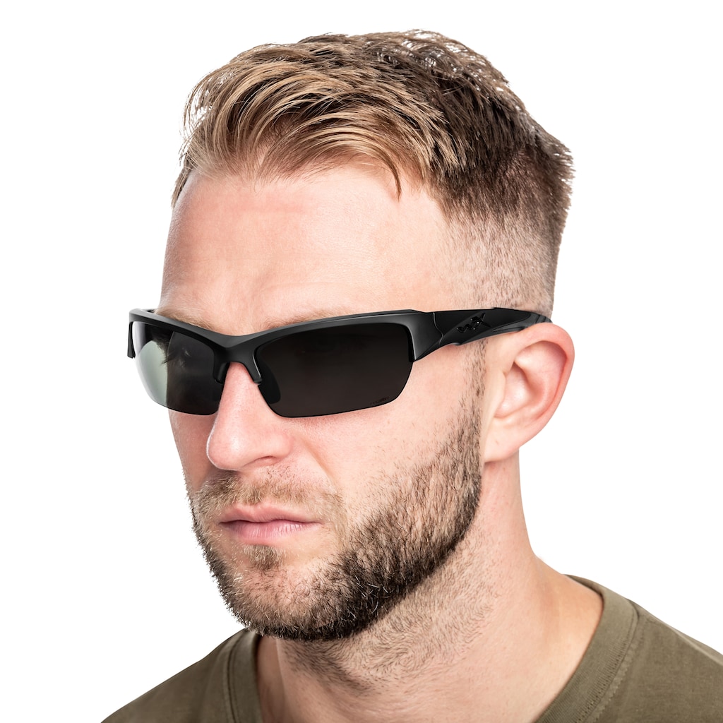 Tactical glasses with polarising sunglasses lenses, compliant with ballistic standards MIL-PRF-32432A, ANSI Z87.1 and EN.166S. The set includes a hard case with a zip, neck strap and microfibre cloth.