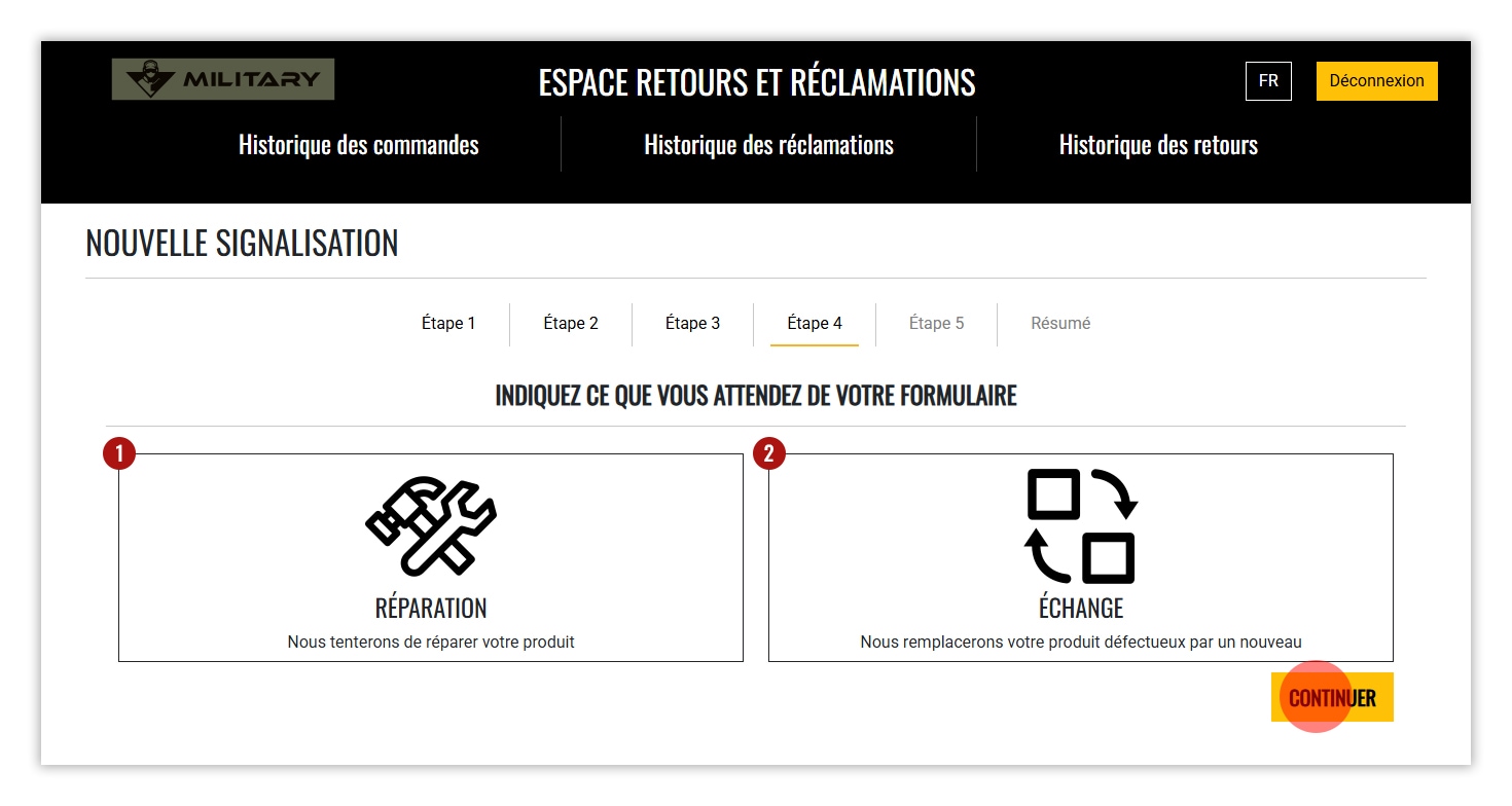 6. Sélectionnez la solution souhaitée : RÉPARATION ou REMPLACEMENT