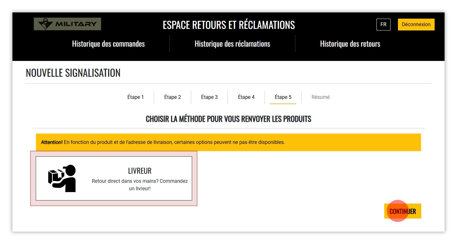 7. Sélectionnez la méthode de retour des marchandises