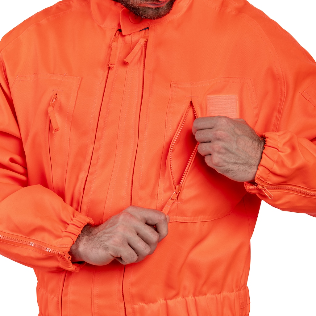Combinaison en orange créée à partir d'un mélange de polyester résistant (80%) et de coton léger et respirant (20%). Le matériau se distingue par sa durabilité et sa ventilation adéquate. Une fermeture éclair bidirectionnelle facilite l'habillage et le déshabillage, tandis qu'une coupe ample assure une totale liberté de mouvement. La fermeture se termine par un col droit bas avec un bouton supplémentaire.