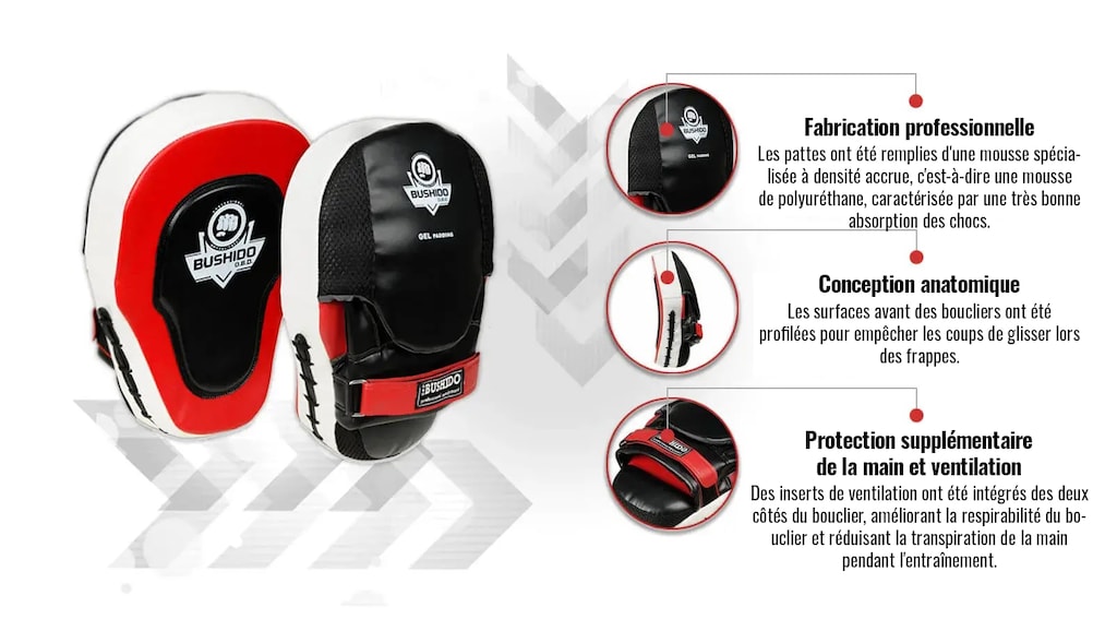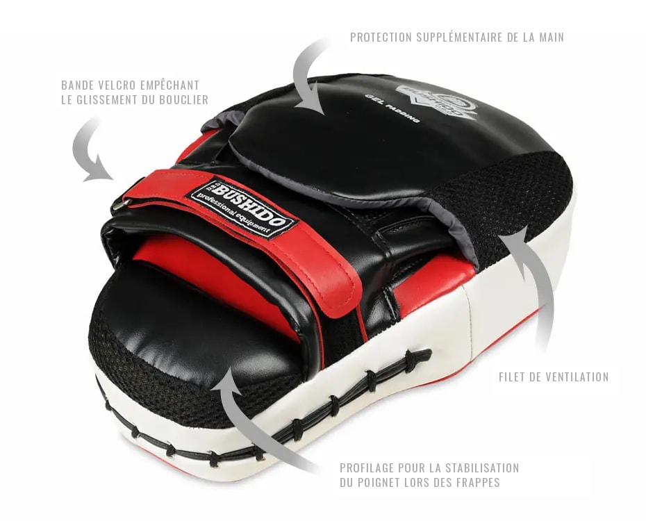 La formeanatomique des boucliers empêche la surcharge des poignets lors d'un entraînement intensif et réduit le risque de blessure. La conception spéciale de l'avant des boucliers empêche les coups de glisser lors des frappes.