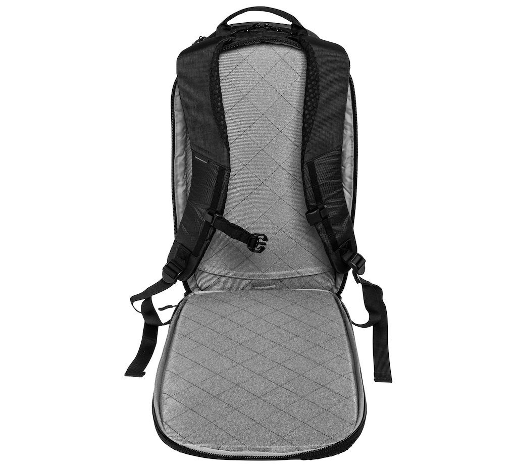 À l'intérieur se trouve un compartiment pour ordinateur portable ainsi qu'une sangle amovible et réglable qui stabilise l'équipement transporté. La partie arrière du sac à dos contient un compartiment adapté au transport de petits éléments d'équipement. Le fond renforcé et rembourré empêche la déformation du contenu et permet de placer le sac à dos en position verticale.