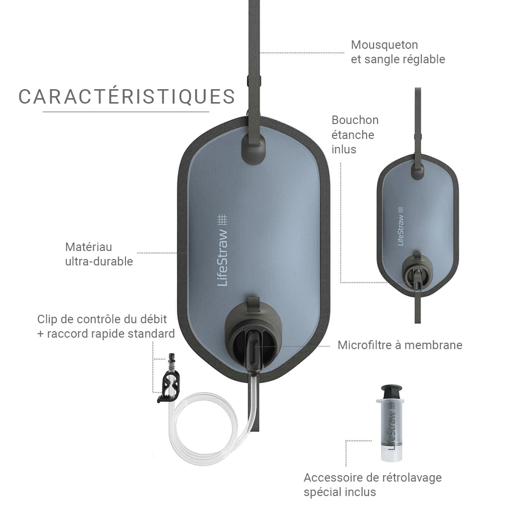 Le sac à gravité de 8 litres inclus peut être suspendu à un arbre ou au couvercle d'un coffre de voiture. Il est fabriqué en plastique sans BPA et le matériau n'altère ni le goût ni l'odeur des liquides transportés. Une fois vide, le sac peut être enroulé et rangé dans un sac à dos.