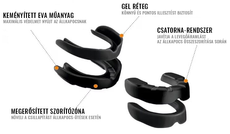 A védőfelszerelés légátjárókkal van felszerelve, amelyek megkönnyítik a levegő áramlását az állkapocs összeszorítása közben. A külső kiemelések minimalizálják a védőfelszerelés elmozdulását. Az egyedi fogazat formájához való hőformálással történő igazítás növeli a védelem hatékonyságát és a viselési kényelmet.