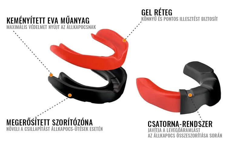 A védő légzőcsatornákkal van felszerelve, amelyek megkönnyítik a levegő áramlását az állkapocs összeszorítása során. A külső kiemelkedések minimalizálják a védő elmozdulását. Az egyéni fogalakhoz való termikus formázás lehetősége növeli a védelem hatékonyságát és a viselési kényelmet.