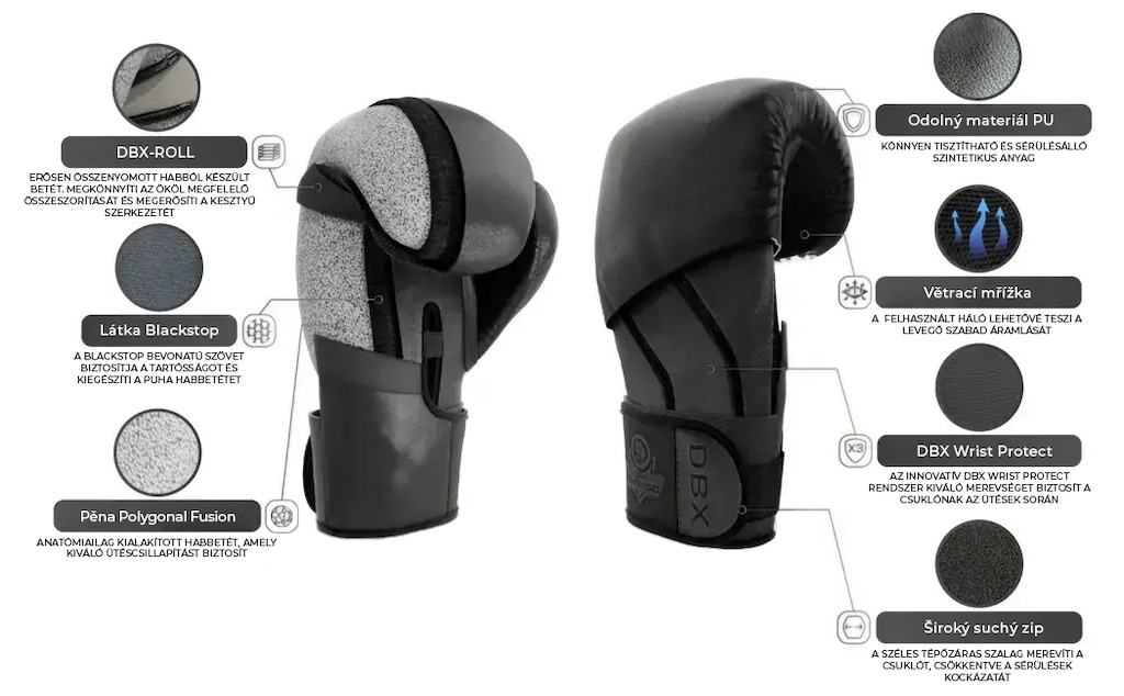 Az ívnél elhelyezett DBX-Roll betét magasan tömörített habból áll, ami jelentősen megkönnyíti a kéz ökölbe szorítását és erősíti a kesztyű szerkezetét. A széles, erős tépőzáras szalag rögzíti a csuklót, csökkentve a sérülés kockázatát. A hüvelykujjat egy szalag rögzíti a kesztyűhöz, ami megakadályozza az ujj kificamodását erős ütések során.