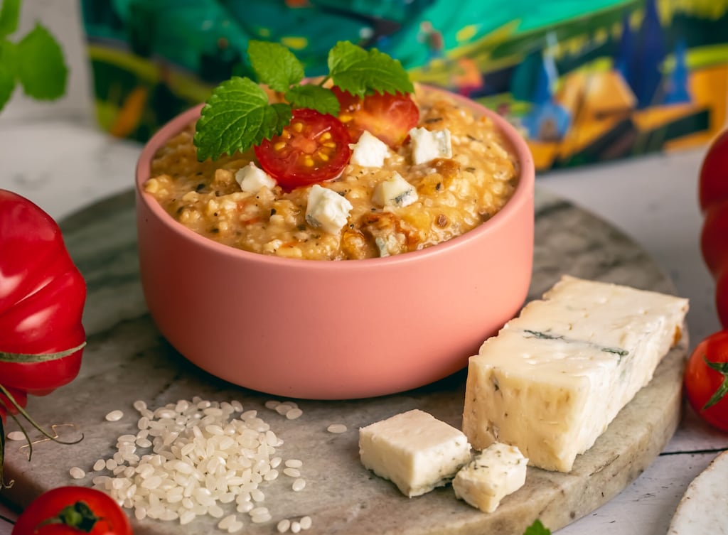 Intenzív paradicsomos ízű rizottó, kiváló minőségű arborio rizsből készült, amely garantálja a megfelelő állagot és az étel krémes textúráját. A szárított paradicsom és paradicsompüré keveréke intenzív aromát kölcsönöz az egésznek, amely a mediterrán konyhából inspirálódott.