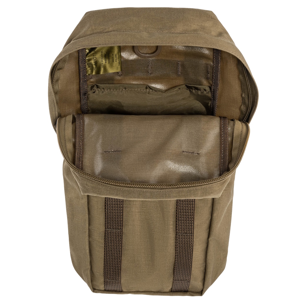 Oldalzseb barna színben, 8 literes űrtartalommal, tartós Cordura 500D anyagból készült, amely nagy ellenálló képességéről ismert a sérülésekkel és kopással szemben. A zseb alja és oldalai megerősítettek, ami növeli a tartósságot terepi használat során. Az alkalmazott anyagok megfelelnek a NIR (Near Infrared) követelményeknek, ami csökkentett láthatóságot jelent az infravörös tartományban. Cipzárral zárható, amely könnyű hozzáférést biztosít a tartalomhoz.