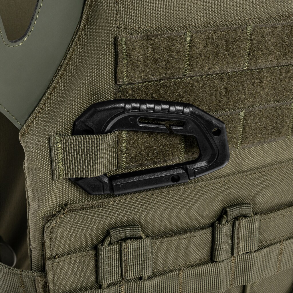Set of 3 carabiners in black. Characterized by low weight, enabling quick and easy assembly of accouterments. Carabiners are made from durable ABS material and feature a non-slip texture, making it easy to use them with gloves on.