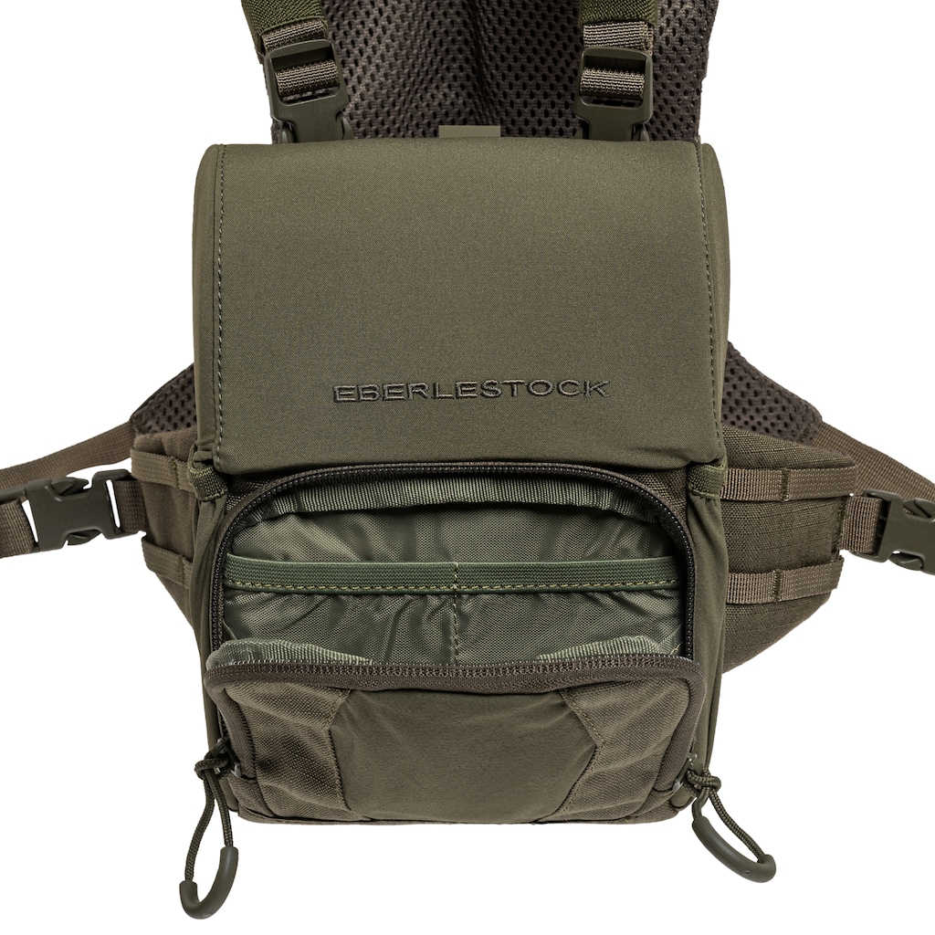 The spacious compartment with internal dimensions of 20 x 14 x 6 cm is designed for safe carrying of binoculars but is spacious enough for other equipment. Inside, there are two elastic holders, which stabilize the binoculars during use. Magnetic closure allows for one-handed opening, and the sturdy interior construction ensures stability and protection against pressure and mechanical damage. A front zippered pocket and two open side pockets made of elastic material offer additional space for small accessories.