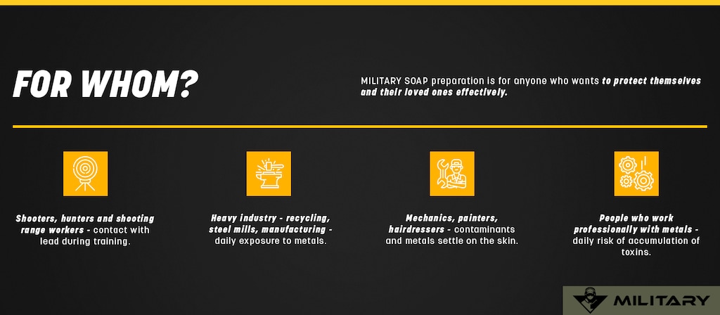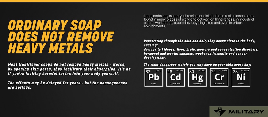Military Soap is a specialized cleansing product with a capacity of 300 ml, formulated for the effective elimination of heavy metals from hands, body, and hair. As the only item of its kind on the market, it is designed for those who are exposed to toxic substances like lead, mercury, cadmium, chromium, nickel, and copper. The soap neutralizes and removes contaminants while preserving the skin’s protective barrier.