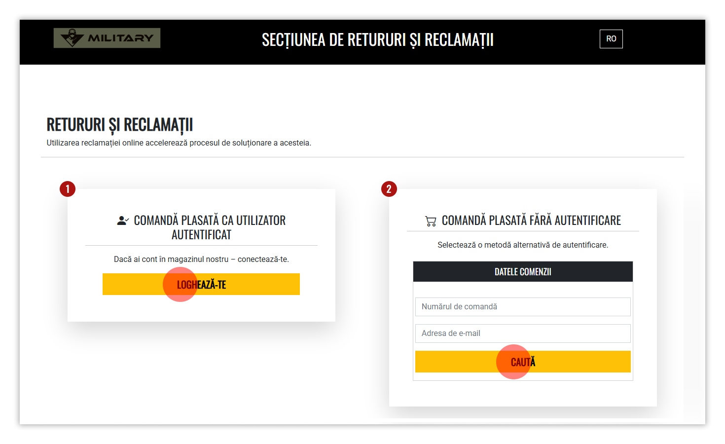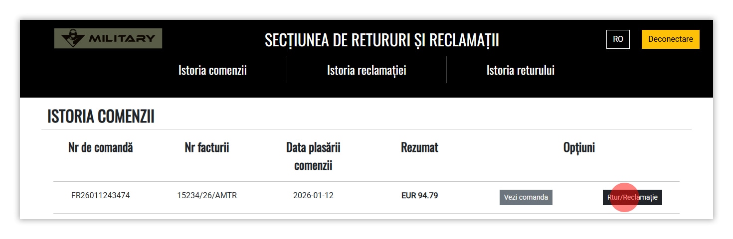 - Găsește comanda corectă și dă clic pe RETURNEAZĂ/RECLAMĂ.