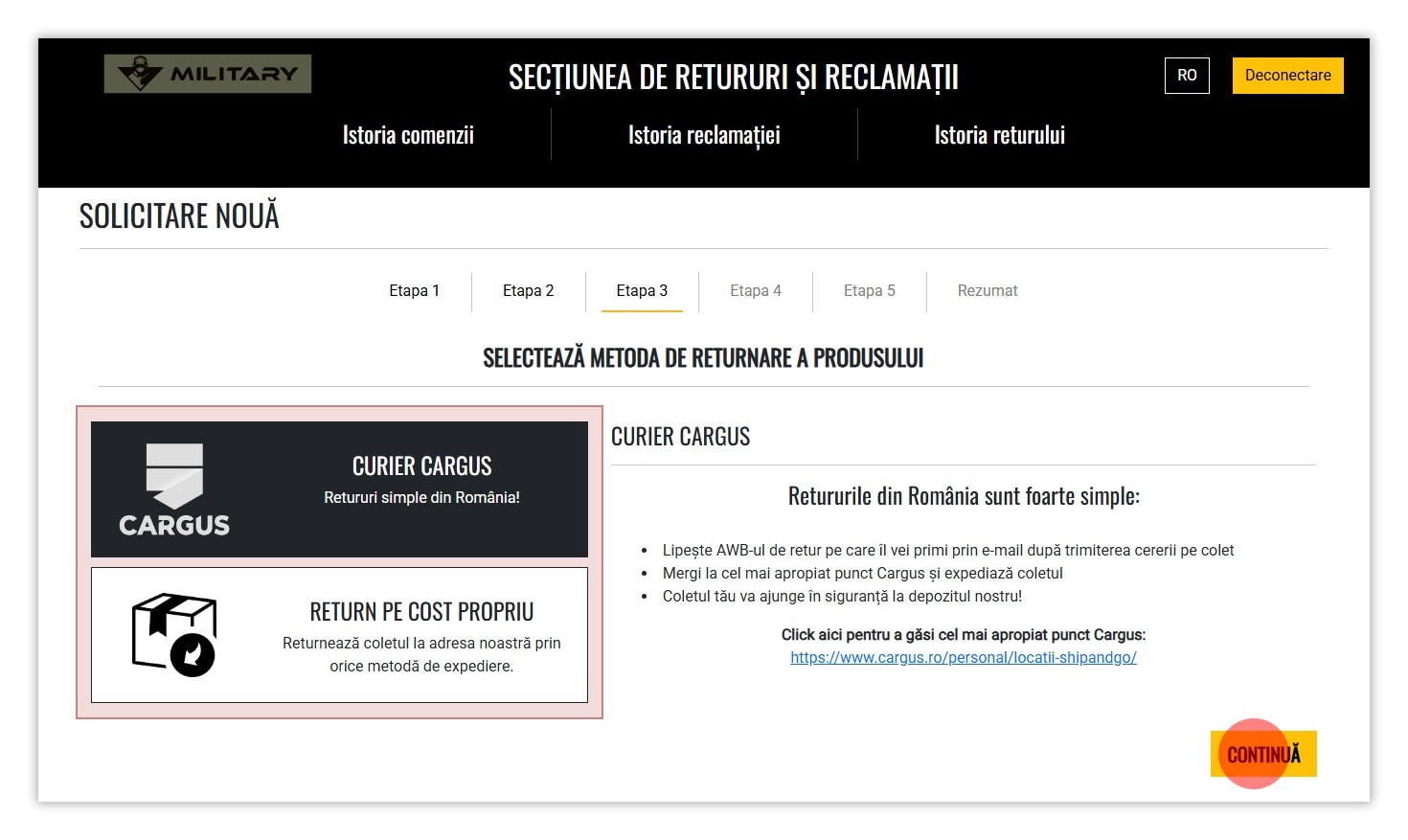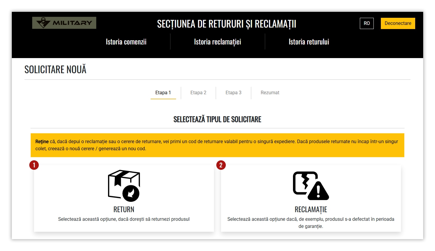 3. Selectează tipul de caz RETUR sau RECLAMAȚIE