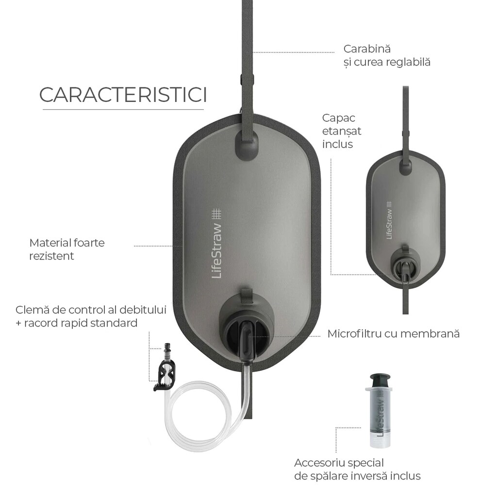 Un sistem versatil de filtrare a apei, acesta poate fi utilizat în 4 moduri: ca filtru personal cu paie, cu o pungă gravitațională atașată, ca filtru pentru trusele de hidratare sau atașat la majoritatea sticlelor de apă de unică folosință. Un dop mare permite umplerea și curățarea ușoară, în timp ce un al doilea dop mai mic sigilează conexiunea pentru depozitarea apei.