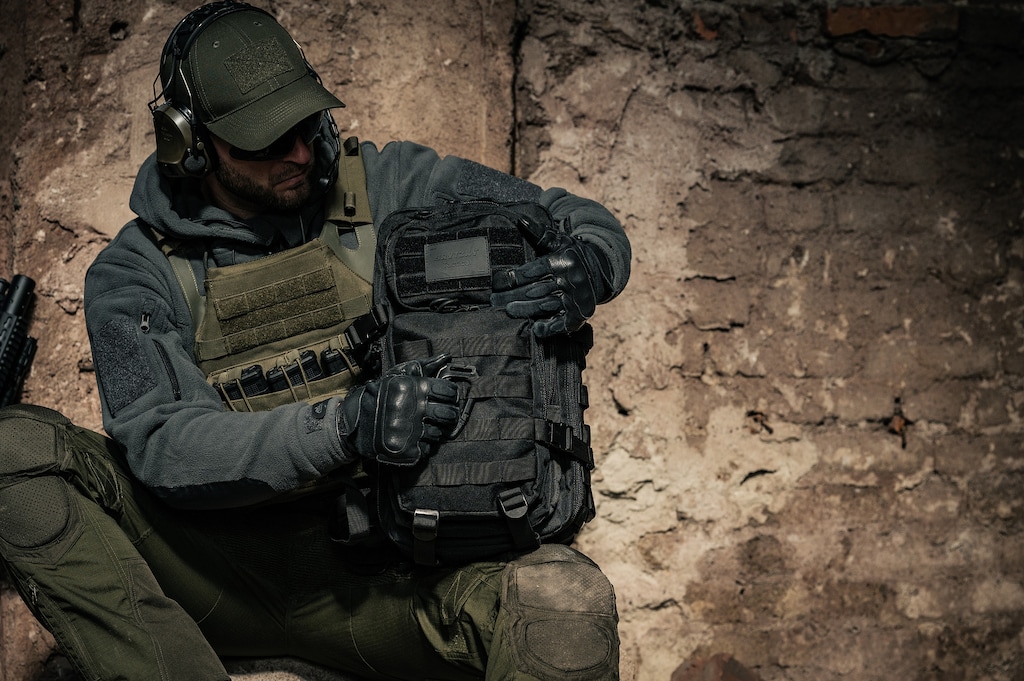 Тактичні дії: Рюкзак є частиною спорядження, яке використовується на місцевості. Сумісність з системою MOLLE/PALS і можливість розширення додатковими модулями дозволяють налаштувати конфігурацію під специфіку завдання. Панель velcro дозволяє прикріпити нашивки або емблеми.