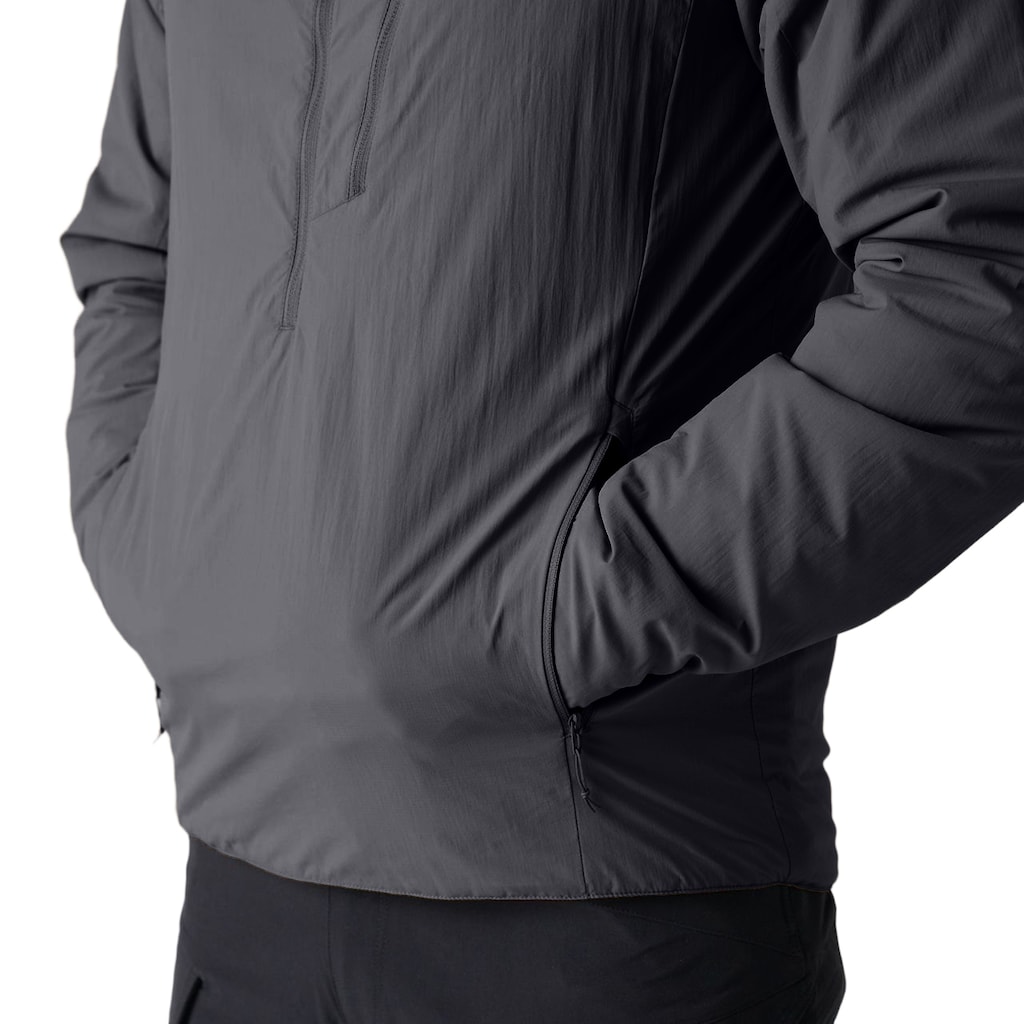 Анорак чорного кольору ефективно захищає від холоду, вітру та легкого дощу. Його можна носити двома способами — як верхній одяг у перехідний період або як додатковий утеплюючий шар. Зовнішній матеріал покритий гідрофобним покриттям.